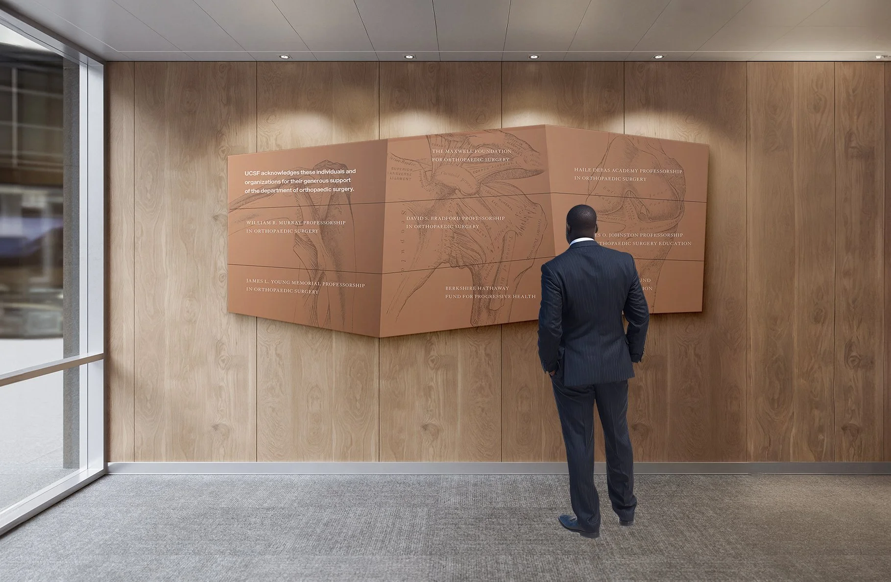 As the form continues, it establishes a clear rhythm for all three groups, provides a flexible structure for yearly resident updates, and ties the corridor into one intentional experience. The result is an installation that feels refined, adaptable, and distinctly connected to UCSF’s identity.